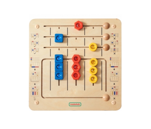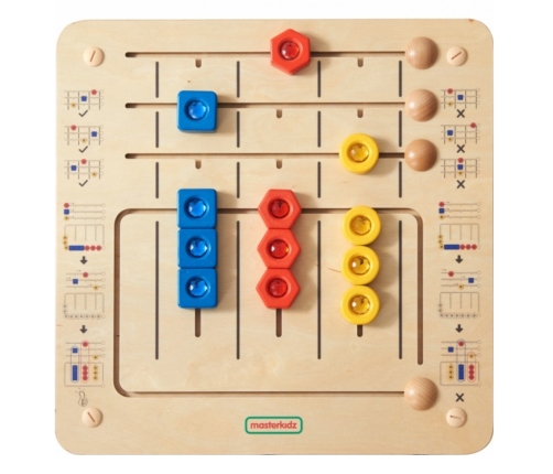 Ta tablica edukacyjna skupia się na rozpoznawaniu kształtów i motoryce małej. Jest podzielona na dwie części: górna zawiera pasek zadań, w którym dzieci muszą umieścić trzy kształty (czerwony sześciokąt, niebieski kwadrat i żółte koło) w odpowiednich miejscach. Dolna część planszy to trzy kolumny z 9 kształtami, które dzieci muszą dopasować do właściwych miejsc, koncentrując się na kolorze i kształcie. Elementy są umieszczone na tablicy w sposób umożliwiający ich łatwe przesuwanie, ale niemożliwe do zgubienia. Tablica może być używana na biurku lub zamontowana na ścianie.