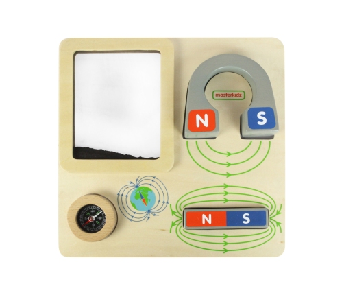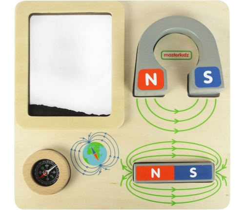 Drewniana tabliczka edukacyjna, dzięki której dziecko będzie mogło na własne oczy zobaczyć jak działa magnes. Zabawka zawiera duży magnes w kształcie podkowy, z oznaczonymi biegunami, a także magnes w kształcie bloczka. Na tabliczce znajduje się również pojemniczek z opiłkami żelaza. Przyciągając je, dziecko może obserwować linie magnetyczne. Zabawka posiada również kompas.