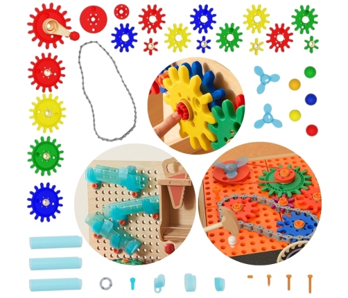 Zestaw kolorowych trybików i kół zębatych, które pozwalają na skonstruowanie skomplikowanych mechanizmów. Zabawkę montuje się na Tablicy Warsztatu Masterkidz STEM przy pomocy specjalnych śrub Masterkidz. Zabawa kołami zębatymi poprawia motorykę dziecka, zdolność logicznego myślenia, a także kreatywność