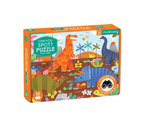 Puzzle obserwacyjne Park dinozaurów amerykańskiej marki MUDPUPPY nadają układaniu puzzli nowy wymiar – na samym złożeniu obrazka zabawa się bowiem nie kończy. Układanka o wymiarach 45,75 x 35 cm składa się z 12 elementów, po ułożeniu przedstawiających dinozaury w prehistorycznym górsko-stepowym krajobrazie. To jednak jeszcze nie wszystko! Dodatkowo do puzzli dołączona jest plansza z 5 ilustracjami – szczegółami, które należy odszukać na obrazku. Maluch z pewnością chętnie je wszystkie odnajdzie. Poręczny format elementów i intensywne barwy dodatkowo zachęcają do zabawy.