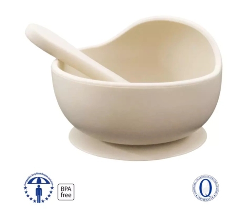 Silikonowa miseczka z łyżeczką pomaga rozwijać umiejętności motoryczne u dzieci.