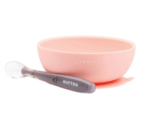 Dwuczęściowy silikonowy zestaw naczyń Nattou wykonany z miękkiego silikonu jest bardzo praktyczny, naczynia są łatwe do trzymania i antypoślizgowe.