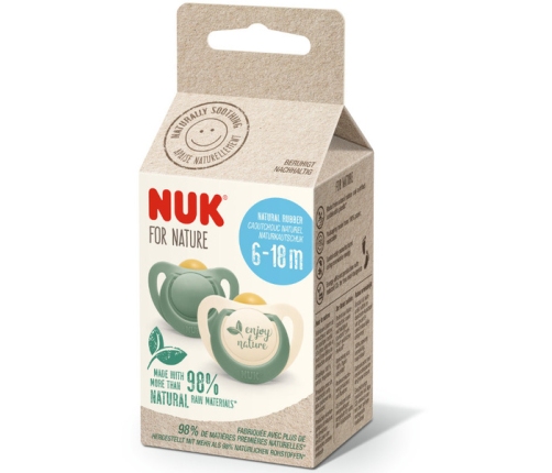 Smoczek NUK for Nature: wykonany w ponad 98% z naturalnych surowców – składa się z naturalnego kauczuku oraz certyfikowanego, odnawialnego plastiku* oryginalny kształt NUK – inspirowany przez naturę, akceptowany przez 95% niemowląt, szczególnie przyjazny karmieniu piersią, nie zakłóca karmienia piersią, nie powoduje zniekształcenia zębów, ani wad zgryzu, rekomendowany przez ekspertów medycznych** opakowanie wykonane w 100% z papieru – podlega recyklingowi wyprodukowany w sposób zrównoważony korzystając z odnawialnej energii, produkcja efektywna energetycznie, zredukowana emisja CO₂, minimalny ślad węglowy Naturalne uspokaja najlepiej Dlatego wykorzystujemy ponad 98% naturalnych surowców przy produkcji naszego smoczka NUK for Nature. Do produkcji części twardych użyto odnawialnego plastiku**. Miękki smoczek wykonano z czystego, naturalnego kauczuku.