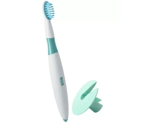 Szczoteczka do zębów dla dzieci NUK opracowana dla dzieci od 12 miesiąca. Zaokrąglona główka szczoteczki została specjalnie zaprojektowana, tak aby pasowała do małej buzi dziecka, a zaokrąglone, miękkie włókna czyszczą dokładnie, ale delikatnie i bezboleśnie. Szczoteczka została posiada antypoślizgowy uchwyt, który zapobiega wypadnięciu szczoteczki z rączek. Dodatkowo w opakowaniu znajduje się pierścienień zabezpieczający, który zapobiega włożeniu szczoteczki do buzi za daleko.