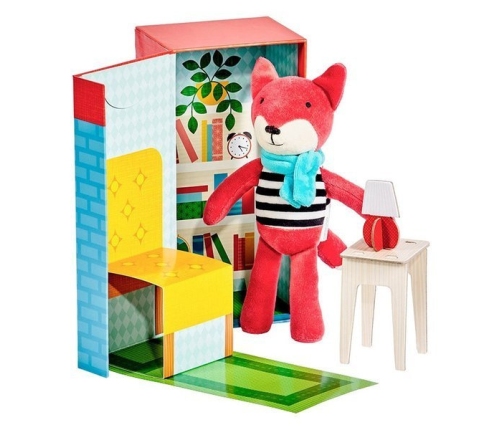 Lisica Frances zapakowana jest w pudełko, które pełni rolę scenki do zabawy - jej własnego pokoju, w którym uwielbia czytać ciekawe książki. Do zestawu dołączone są kartonowe meble, które możesz złożyć samodzielnie. Maskotka wykonana jest w 100% z bawełny.