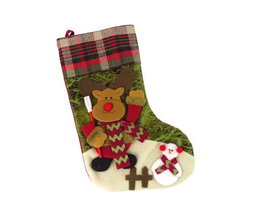 The Christmas fabric gift sock is made of a felt-like material. It features a reindeer in a patterned warm jumper. The whole thing is red, with a checkered stripe on top and cream fur on the bottom.