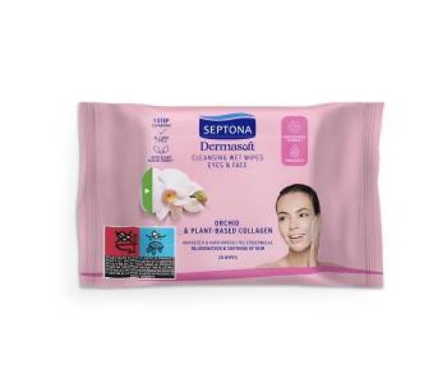 Septona Dermasoft Oczyszczające Chusteczki Nawilżane z Orchideą i Kolagenem Roślinnym Do Twarzy i Oczu 20szt.