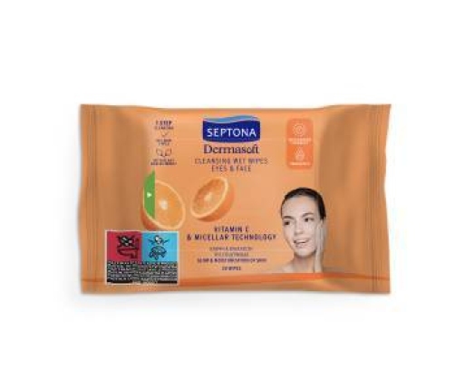 Septona Dermasoft Oczyszczające Chusteczki Nawilżane z Witaminą C i Technologią Micelarną Do Twarzy i Oczu 20szt.