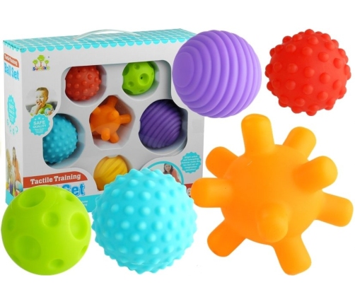 Prezentowany zestaw składa się z 6 różnych kul. Piłeczki posiadają wgłębienia i wypustki, dzięki czemu dziecko odkryje ogrom nowych wrażeń. Kształt zabawek sprzyja dodatkowej zabawie, jaką jest turlanie i rzucanie, co można połączyć z dozą aktywności fizycznej dla dziecka. Łapanie piłeczek usprawni umiejętność chwytania, natomiast kolory i ich faktury ułatwią zabawę w zapamiętywanie i odgadywanie, równocześnie rozwijając wyobraźnię.