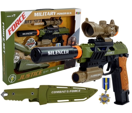 All elements are made of high-quality plastic, which is a guarantee that they will serve your child for a long time. The whole set is maintained in the colour scheme of dark green. After pressing the trigger, the gun emits the sound of shooting, reloading and the sound of falling shells. After attaching the silencer the sound is completely different. During these actions you can additionally notice light effects on the weapon. No enemy will escape! Your little one's imagination will certainly run wild. On the other hand, to increase accuracy and precision, the pistol is equipped with a target sight, which will make the shot more precise. The torch will additionally illuminate the room. A long rubber knife will also be indispensable during battle.