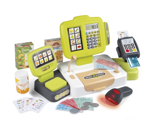 Kasa sklepowa z akcesoriami od Smoby to idealna propozycja zabawy dla dzieci. Dzieci mogą zważyć produkty, a następnie nabić je na kasę. Przy pomocy czytnika zeskanują ciasteczka czy makaron. Następnie kupujący może zapłacić pieniążkami lub kartą płatniczą.
