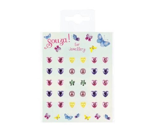 Komplet kolczyków samoprzylepnych Motyle holenderskiej firmy Souza. Zestaw to aż 30 sztuk (15 par) małych kolczyków w kształtach serduszek (fuksjowe, ciemnofioletowe oraz żółte), kółek (ciemnoróżowe) i kwiatków (ciemnozielone). Kolczyki są nietoksyczne oraz nie podrażniają skóry. Samoprzylepna biżuteria to bezinwazyjny oraz bezpieczny wybór dla dzieci zamiast tradycyjnych ozdób. Dodatkowo dzięki wielu elementom wystarczy na długi czas. Idealna na prezent lub jako dodatek do niego.