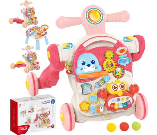 - Izglītojošā 4in1 rotaļlieta: stūmējs, skrejritenis, braucamā un galds,