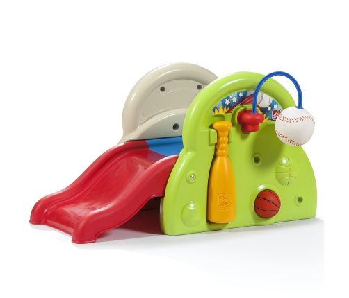 Plac zabaw od firmy STEP2 ma wiele sposobów na zabawę. W tym wciągającym centrum aktywności dla małych dzieci jest głównie tematyka sportowa. Dzieci mogą ćwiczyć równowagę i motorykę, wspinając się po bardzo szerokim stopniu i zjeżdżając na zjeżdżalni po drugiej stronie. Jest także piłka oraz obręcz do koszykówki co pozwala maluchowi wrzucać do celu. Dodatkowo można użyć dołączonego kija, aby uderzać w uwiązaną piłkę baseballową! Dzięki tej zabawce sportowej, zaprojektowanej specjalnie dla najmłodszych, Twój mały robaczek będzie skakał do domu, wślizgiwał się do bazy i robił niesamowite wsady do kosza podczas zabawy. Gdy zabawa się skończy, użyj wbudowanego schowka, aby schować piłkę do koszykówki i wciśnij kijek na zewnętrznej ścianie centrum aktywności, aby wszystko było blisko na następny dzień zabawy.