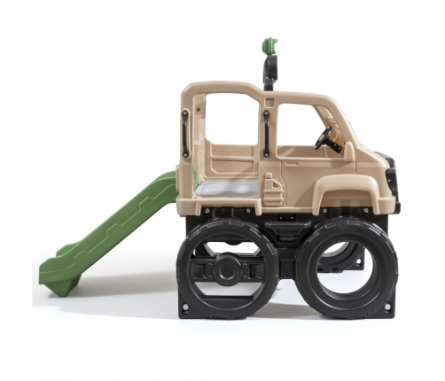 Safari Truck od marki Step2 to solidna platforma wspinaczkowa ze zjeżdżalnią w kształcie samochodu terenowego. Realistyczny wygląd pojazdu, duże koła oraz otwarty dach zachęca dziecko do zabawy w ogrodzie. Mali poszukiwacze przygód mogą wspiąć się na ogromne koła, jak po schodach, na najwyższą platformę, gdzie znajduje się lornetka przez którą mogą dostrzec dziką przyrodę. Plac zabaw wykonany jest z wysokiej jakości bezpiecznego tworzywa sztucznego, wytrzymałe i trwałe.