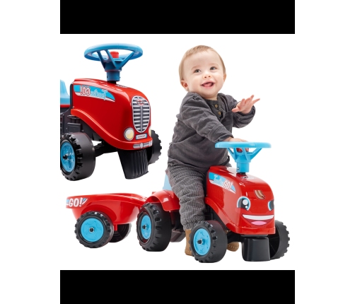 Traktors ir aprīkots ar atvienojamu piekabi ar paneļiem, kā arī stūri ar signālu. Traktora riteņi ir izgatavoti no augstas kvalitātes plastmasas. Klāt pie traktora ir arī uzlīmes, kas ļaus bērnam izvēlēties savu unikālo stilu. Smaidoša seja vai standarta uzlīme? Pārsteidz visus un uzlīmē to uz transportlīdzekļa priekšpuses!