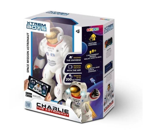 Charlie to 50 niezwykle interesujących funkcji i możliwość programowania do 200 czynności! Można nim sterować za pomocą aplikacji na urządzeniu mobilnym (nie jest potrzebny kontroler), za pomocą żyroskopu (pochylając urządzenie mobile) oraz za pomocą gestów (odpowiednie ruchy rąk).
