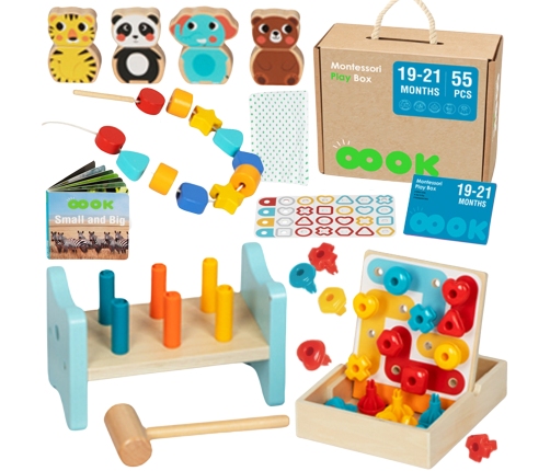 TOOKY TOY oferuje Edukacyjny Box zabawek Montessori. Ta drewniana zabawka przeznaczona jest dla dzieci od 19-21 miesiąca życia. Walizka zawiera 5 różnych rozwijających gier i zabawek, które na pewno zainteresują twojego malucha. Taki box, to świetny sposób na rozwijanie umiejętności poznawczych, emocjonalnych oraz motorycznych u maluchów! Do zestawu dołączona jest instrukcja obsługi, która zawiera informacje na temat zawartości boxa, instrukcji obsługi zabawek oraz przydatne porady.