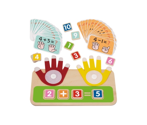 - - Drewniana podstawa z dwoma ruchomymi dłońmi (czerwoną i żółtą) imitującymi liczenie na palcach