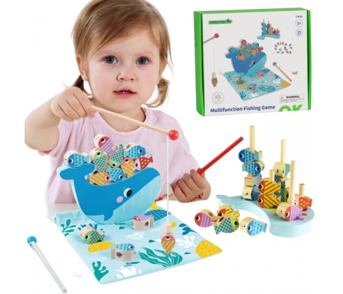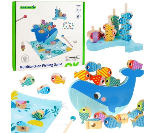 TOOKY TOY Drewniana Gra Wieloryb i Rybki Wielofunkcyjna 4 w 1 jest ulepszoną wersją klasycznej magnetycznej gry wędkarskiej, która została rozszerzona o dodatkowe tryby gier. Dzięki różnym trybom gry, można w bardzo łatwy i szybki sposób przejść od jednej gry do innej. Niezależnie od tego czy w naszej grze będzie element rywalizacji, to możemy być pewni, że dziecko będzie pracować nad koordynacją wzrokowo-ruchową.