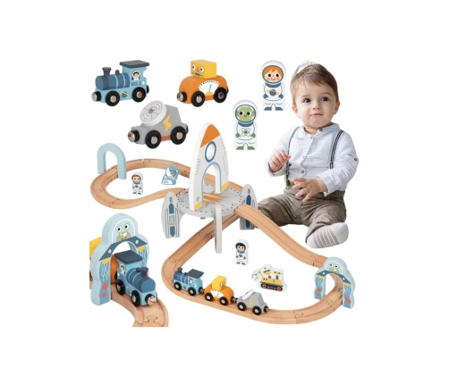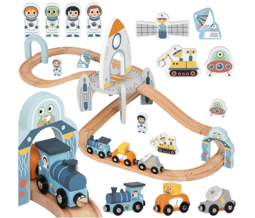 - - zestaw zawiera drewniane tory składane, pociąg z dwoma wagonikami, postacie kosmonautów, akcesoria kosmiczne m.in satelitę, łazik i latający spodek oraz rakietę i łuk z wizerunkiem kosmity,