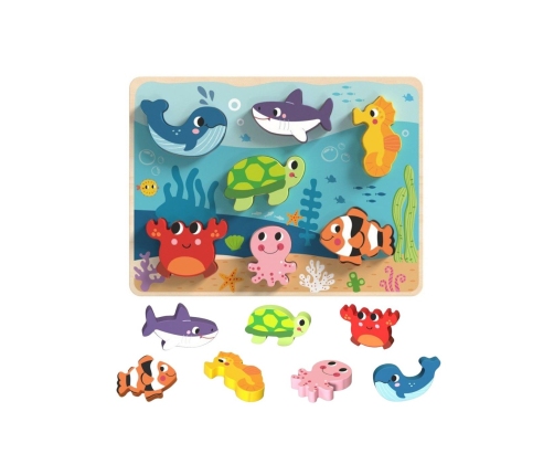 Drewniane Puzzle Świat Morza od TOOKY TOY dla dzieci od 12 miesiąca życia to bardzo ładnie wykonana układanka, która jest idealnym rozwiązaniem do domu czy przedszkola. Składa się z planszy oraz 7 elementów tematycznych, które należy do niej zamontować. Na drewnianej podstawce znajdują się wgłębienia, które swoim kształtem odpowiadają kolorowym puzzlom. Całość wykonana została z drewna, pomalowana bezpiecznymi dla dziecka farbami, które zadowolą każdego użytkownika i dadzą mnóstwo radości z zabawy.