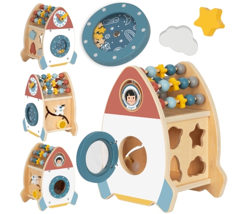 - - posiada 6 aktywności: przesuwanie i obracanie koralików, sortowanie kształtów, ustawiane wskazówek zegara, obracanie galaktyki, obracanie kosmonauty, otwieranie i zamykanie rakiety.