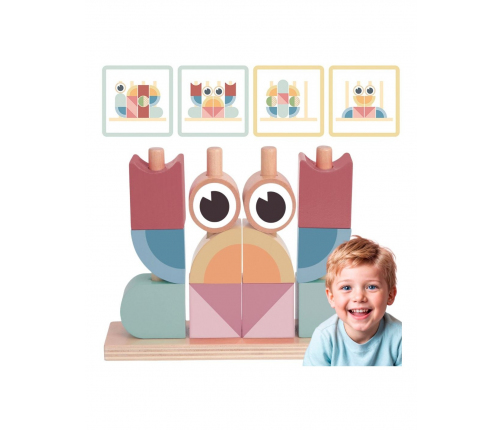 - - zestaw zawiera 18 elementów: drewnianą podstawkę do układania, 12 klocków oraz 5 dwustronnych kart z wzorami