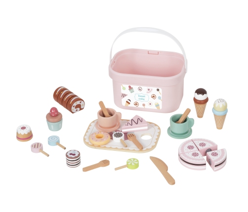 - - Zestaw zawiera: Pudełko, tort, roladę, babeczkę, muffinkę, ciastko, pączka, kawałek ciasta, 4 lizaki, 2 lody w wafelku, 2 filiżanki, 2 łyżeczki, 2 widelce, nożyk