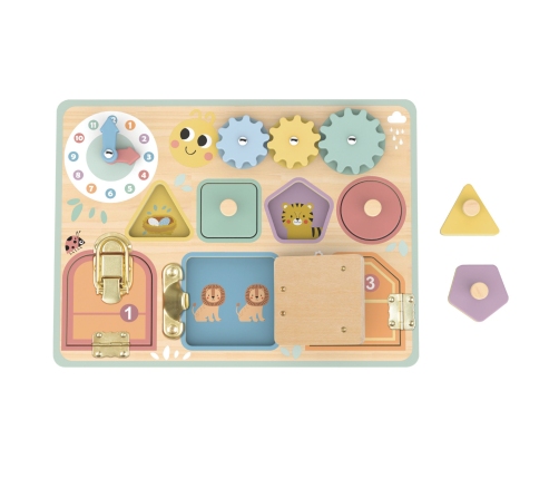 Tablica składa się z solidnej drewnianej płyty, na której umieszczone są trzy różnorodne zamki. Za nimi kryją się urocze obrazki przedstawiające zwierzęta, które dodatkowo inspirują wyobraźnię malucha. Dodatkowo, tablica wyposażona jest w interaktywne koła zębate, które zapewniają dodatkową dawkę zabawy. Dziecko może swobodnie kręcić nimi, rozwijając zdolności motoryczne i kształtując swoją percepcję światła i cienia.