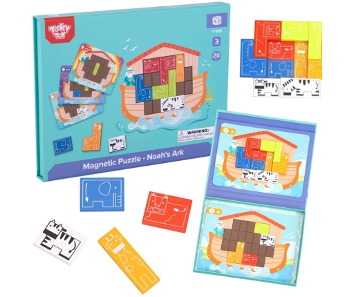 Układanka Arka Noego od marki TOOKY TOY. Zabawka posiada 10 klocków z wizerunkami zwierząt i 15 plansz dwustronnych z 30 wzorami z różnym poziomem do ułożenia. Tak jak Noe, dziecko musi dopasować tak zwierzęta w arce, aby zapełnić całą plansze. Zabawka rozwija zdolności manualne, logiczne myślenie oraz poprawi koncentracje Twojego dziecka. Oprócz świetnej zabawy, układanka logiczna pozwoli poznać historię Arki Noego i zaciekawić dziecko.