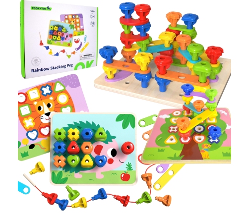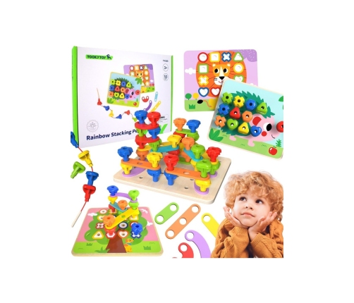 Zestaw Kołków od marki TOOKY TOY to wielofunkcyjna zabawka, która pozwoli rozwinąć kreatywność, logiczne myślenie oraz koncentrację na wiele sposobów. Budowanie, dopasowanie, sortowanie, nawlekanie w jednym zestawie. W zestawie znajdują się kołeczki, które dziecko może wciskać w drewnianą planszę, a na już wciśniętych kołeczkach można dokładać belki budować wielopoziomowe konstrukcje. Każdy z 30 kołeczków jest inny od pozostałych kolorem lub kształtem, a na 8 kartach plansz znajdują się symbole do odnajdowania odpowiedniego kołeczka. Dodatkowo w zestawie znajduje się drewniana igła ze sznureczkiem do nawlekania. Bardzo ciekawa propozycja dla każdego, kto poszukuje wielofunkcyjnego zestawu, który wspomoże rozwój umysłowy i manualny dziecka.