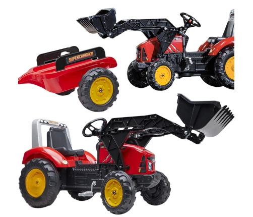 FALK traktors uz pedāļiem ar piekabi Red Supercharger ir sapņu piepildījums ne vienam vien mazajam traktoru vadītājam. Tas ir rūpīgi izgatavots, pievēršot uzmanību katrai detaļai! Neviens lauksaimnieks ar tādu nepalaidīs garām. Transportlīdzeklis izgatavots no augstākās kvalitātes materiāliem, un tas ir paredzēts bērniem no 3 gadu vecuma. Pārvadājumam ir priekšējais lāpsts, noņemama piekabe ar paneļiem un stūre ar signālu. Traktora riteņi izgatavoti no augstas kvalitātes plastmasas. Traktoram ir arī atverama kapote ar reāla dzinēja imitāciju.