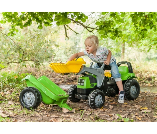 Pedāļu traktors ar piekabi un frontālo iekrāvēju. Piekabe ir viegli pieliekama un noņemama. Izmantojot frontālo iekrāvēju Tavs bērns var veikt dažādus būvdarbus. Piekabē var pārvadāt mantas vai piekraut to ar smiltīm. Traktora motora pārsegs ir atverams.