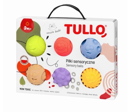 Zestaw sześciu miękkich piłek sensorycznych przeznaczonych do ćwiczeń integracji sensorycznej oraz zabawy. Każda piłka posiada inną fakturę, dzięki czemu dostarcza różnych wrażeń czuciowych. Piłeczki sensoryczne Tullo są polecane przez fizjoterapeutów do masażu niemowląt, w celu rozluźnienia napięcia mięśniowego. Świetnie sprawdzają się podczas zabawy w wodzie, wesołe buźki zapraszają do wspólnej kąpieli.