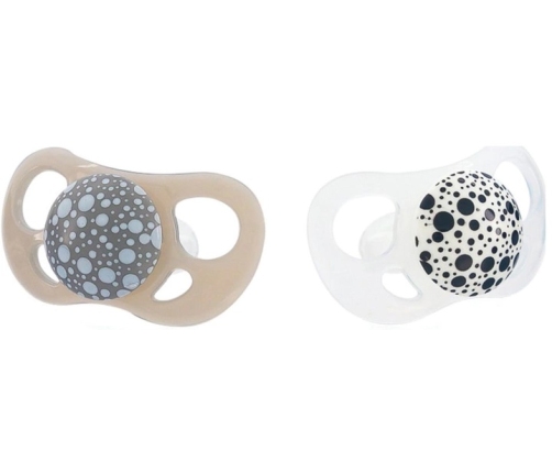 Zaokrąglona tarcza, specjalnie dostosowana do ust niemowląt, ma cztery otwory wentylacyjne, które pomagają utrzymać suchość i wygodę skóry. Ortodontyczny kształt smoczka silikonowego zapewnia zdrowy rozwój zębów Twojego dziecka.