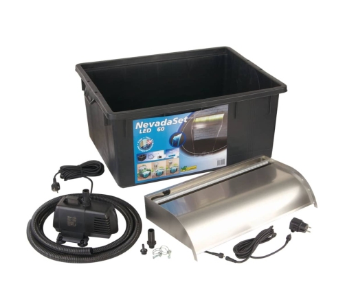 Šajā Ubbink Nevada ūdenskrituma komplektā ar LED iekļauts viss nepieciešamais, lai radītu skaistu ūdens strūklaku: nerūsējoša tērauda ūdenskritums, sūknis, 1,5 metrus gara šļūtene un 150 litru tvertne.
