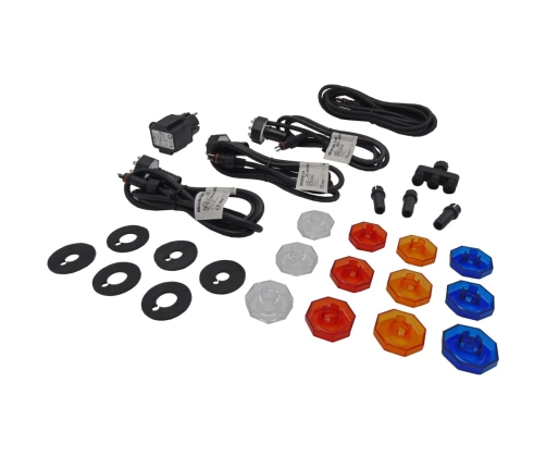 Komplektā ir 3 izturīgas zemūdens lampas, un katrā no tām ir 8 energoefektīvas LED spuldzes. Katrai lampai ir caurspīdīga lēca un 3 papildu krāsainas lēcas. Šīs viedās zemūdens gaismas ir paredzētas uzstādīšanai tieši uz strūklakas ūdens padeves šļūtenēm, lai optimāli izgaismotu ūdens veidolu. Lampas ir piemērotas uzstādīšanai padziļinājumos, kuru diametrs ir 42 mm un dziļums - 25 mm, un tām ir 32 mm atvērums šļūtenei un elektrības vadam.