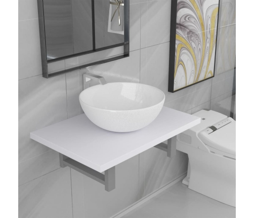 Šajā praktiskā un vienmēr aktuālā dizaina vannasistabas mēbeļu komplektā ir iekļauti sienas plaukts un apaļa izlietne, kas mūsdienīgi papildinās ikvienu vannasistabu vai mazgājamo telpu.