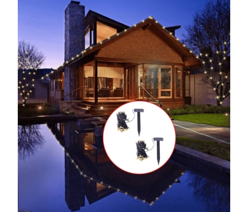 Šajā komplektā ietilpst divas solāro lampiņu virtenes, un katrai virtenei ir 200 LED spuldzes. Šīs gaismu virtenes būs lielisks risinājums āra apgaismojumam.
