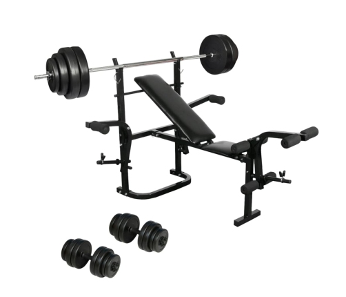 Šīs mājas trenežiera komplekts ietver svaru solu, svaru stieni un hanteles. Tas palīdzēs trenēt dažādus muskuļus.