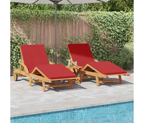Sauļošanās krēsli ir izgatavoti no masīva tīkkoka ar dabīgu apdari, un tie nāk ar ērtām sarkanām polsterētām spilveniem stilam un komfortam. Tie ir regulējami un tiem ir rati, lai viegli pārvietotos.- Vienību skaits: 3