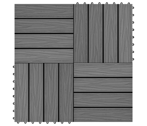 Katras flīzes izmērs ir 30 x 30 cm. Dziļi rievoto WPC terases flīžu komplektā ir iekļautas 11 flīzes, kas kopumā pārklās 1 kvadrātmetru lielu platību. Tās jūsu terasē, balkonā, vannasistabā vai baseina teritorijā radīs sakoptu izskatu.