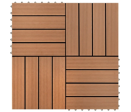 Katras flīzes izmērs ir 30 x 30 cm. Šajā koksnes polimēra kompozītmateriāla terases flīžu komplektā ir iekļautas 22 flīzes, kas kopumā pārklās 2 kvadrātmetrus lielu platību. Tās lieliski noderēs uz jūsu terases, balkona, vannasistabā vai baseina teritorijā.