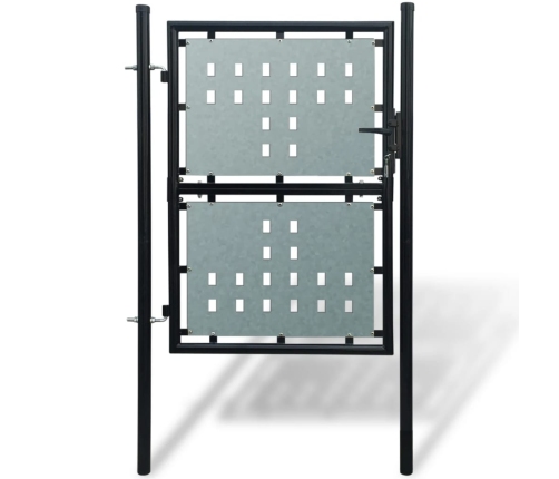Cinkotā tērauda plāksnes ar dekoratīviem caurumiem pastiprinās vārtu rāmi, tāpēc šiem dārza vārtiem ir augsta drošības pakāpe, turklāt tie veido stilīgu ieeju jūsu īpašumā. Vārti ir ražoti no izturīga tērauda, tiem ir pulverkrāsas pārklājums, kas tos pasargās no rūsas un korozijas.