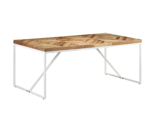 Galds ir izgatavots ar rokām no akācijas un mango masīvkoka, tādēļ tas ir ļoti stabils un izturīgs. Balti pulverkrāsotās tērauda kājas piešķir galdam papildu stabilitāti. Izturīgajai galda virsmai ir V formas mozaīkas dizains, kas būs dekoratīvs jūsu interjera elements. Uz galda var salikt arī dzērienus vai uzkodas.