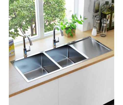 Šī izlietne ir gan praktiska, gan skaista. Divu bļodu izlietne ir izgatavota ar rokām no kvalitatīva nerūsējošā tērauda, kas pārklāts ar antikondensācijas krāsu. Šis materiāls ir noturīgs pret pelējumu un koroziju un nesatur svinu. Izlietnei ir skaņu izolējoši paliktņi, kas samazina troksni. Notecēšanas virsma būs ļoti noderīga ne tikai mazgājot traukus ar rokām, bet arī kā papildu vieta dārzeņu griešanai. Bļodām ir unikāls X-veida notekas dizains, kas paātrina ūdens plūsmu, neļaujot tam uzkrāties izlietnes apakšā.