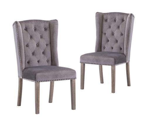 Virtuves krēsli ir apšūti ar mīkstu samta audumu, tādēļ tajos jūs varēsiet ērti pusdienot, lasīt grāmatu vai vienkārši atpūsties. Dekoratīvi iešūtās pogas uz atzveltnes un gar malām esošās metāla kniedes papildina tā klasisko pievilcību. Pateicoties masīvā gumijkoka kājām, šie krēsli ir stabili un izturīgi.