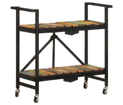 Virtuves galdiņš ir izgatavots no pārstrādāta masīvkoka, kas ir iegūts no vecu, nojauktu māju sijām, grīdas dēļiem un balstiem. Tas var sastāvēt no dažāda veida kokiem, piemēram, tīkkoka, cietkoka, tropu koka vai mango koka. Pārstrādātais koks saglabā šo dažādo koku īpašības. Tā kā pārstrādāts koks jau ir novecojis, nodilis un izžuvis, tas vairs nesarausies un nelieksies. Pulverkrāsotā tērauda rāmis piešķir mēbelei papildu izturību. Šajos uzglabāšanas ratiņos ir 2 nodalījumi, kuros varēs ērti un viegli sasniedzami novietot ēdienu, pudeles un citas nepieciešamas lietas. Pateicoties saliekamajam dizainam, ratiņus var viegli uzglabāt, kad tos nelieto. Virtuves plauktam ir elastīgi riteņi ērtai pārvietošanai.