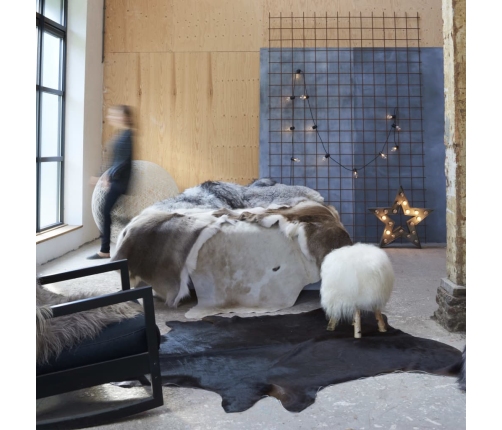 Šis dabīgās govs ādas grīdas paklājs ir ļoti universāls - jūs varat to uzlikt uz krēsla vai izmantot kā unikālu sienas paklāju.